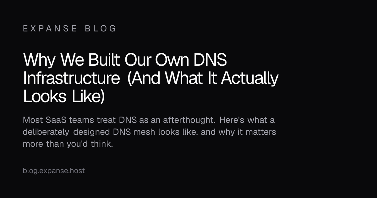 We also offer authoritative DNS hosting for customer domains on this same mesh — the same multi-region secondaries and propagation path we rely on for our own zones. If you want your records on infrastructure we run end-to-end, that’s part of what Expanse provides; say the word when you’re onboarding or reach out.